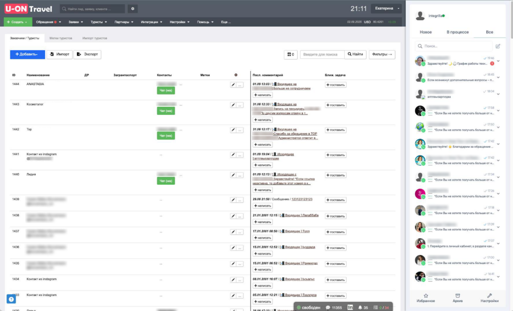 Интеграция U-ON.Travel с WhatsApp, Telegram, Instagram* и VK делает работу турагентства современной и эффективной. Теперь туристы получают ответы быстро и в привычных для себя каналах, а менеджеры работают в едином удобном пространстве, не теряя ни единого обращения.